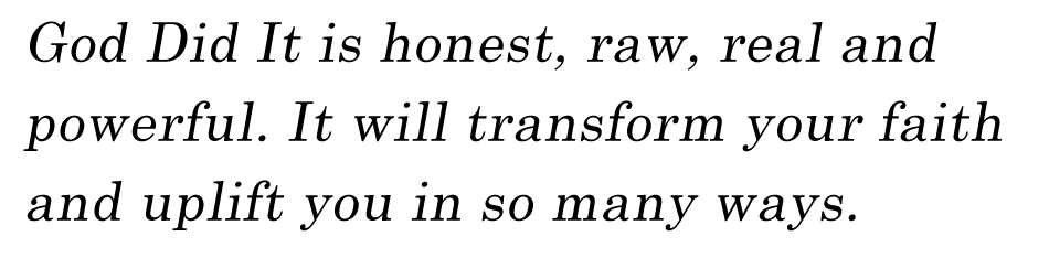If somewhere along the way you stopped believing in miracles, this book will change your mind. Each can’t-stop-reading chapter contains raw and unfiltered details of Dianna’s harrowing journey, plus answers to your most pressing questions like: why must I suffer? Why hasn’t God delivered me yet? And how can I believe, and see miracles in my own life?